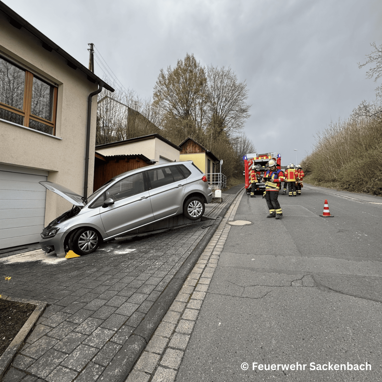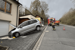 Beim Eintreffen an der Einsatzstelle stand ein Fahrzeug auf einer Mauer und war dabei erheblich beschädigt worden.